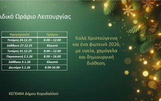 Σε γιορτινό κλίμα πραγματοποιήθηκε στις 22 Δεκεμβρίου 2025 η Γιορτή του Κ.Η.Φ.Η. Κορυδαλλού, ολοκληρώνοντας τον κύκλο των 4 Χριστουγεννιάτικων Εργαστηρίων Δημιουργίας & Μουσικής, με τη συμμετοχή ηλικιωμένων και μαθητών του 3ου Γυμνασίου Κορυδαλλού. Η χορωδία του 3ου Γυμνασίου Κορυδαλλού έντυσε ...