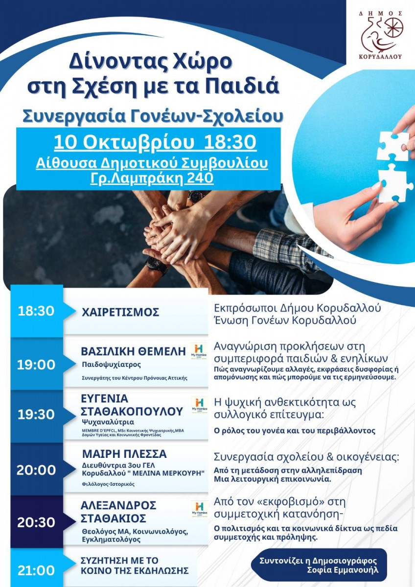 Με μεγάλη χαρά σας προσκαλούμε να παρακολουθήσετε την πολύ ενδιαφέρουσα εκδήλωση που διοργανώνει η Ένωση Γονέων Κορυδαλλού, σε συνεργασία με τον Δήμο Κορυδαλλού και την ΑΜΚΕ My Homiee: «Δίνοντας Χώρο στη Σχέση με τα Παιδιά – Συνεργασία Οικογένειας & Σχολείου».