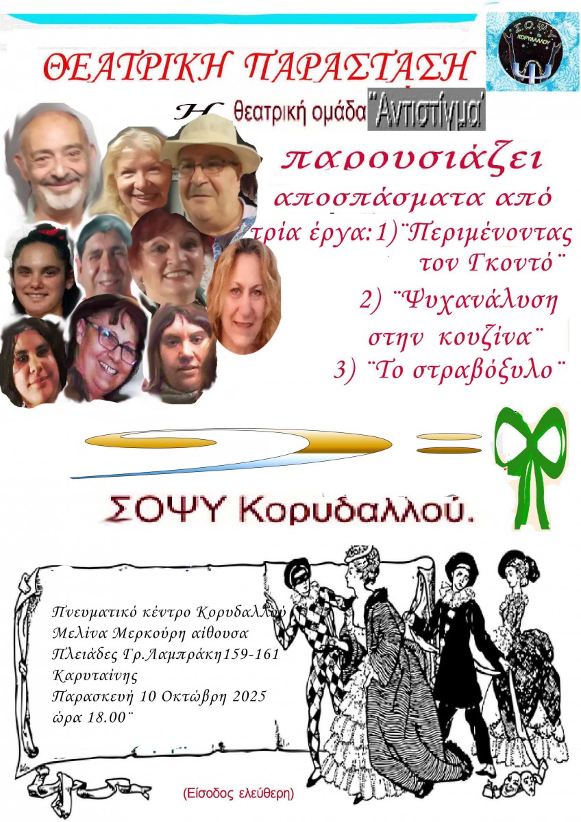 18:00- 19:00: Θεατρική παράσταση με ελεύθερη είσοδο από τη θεατρική Ομάδα «Αντίστιγμα» του Σ.Ο.Ψ.Υ