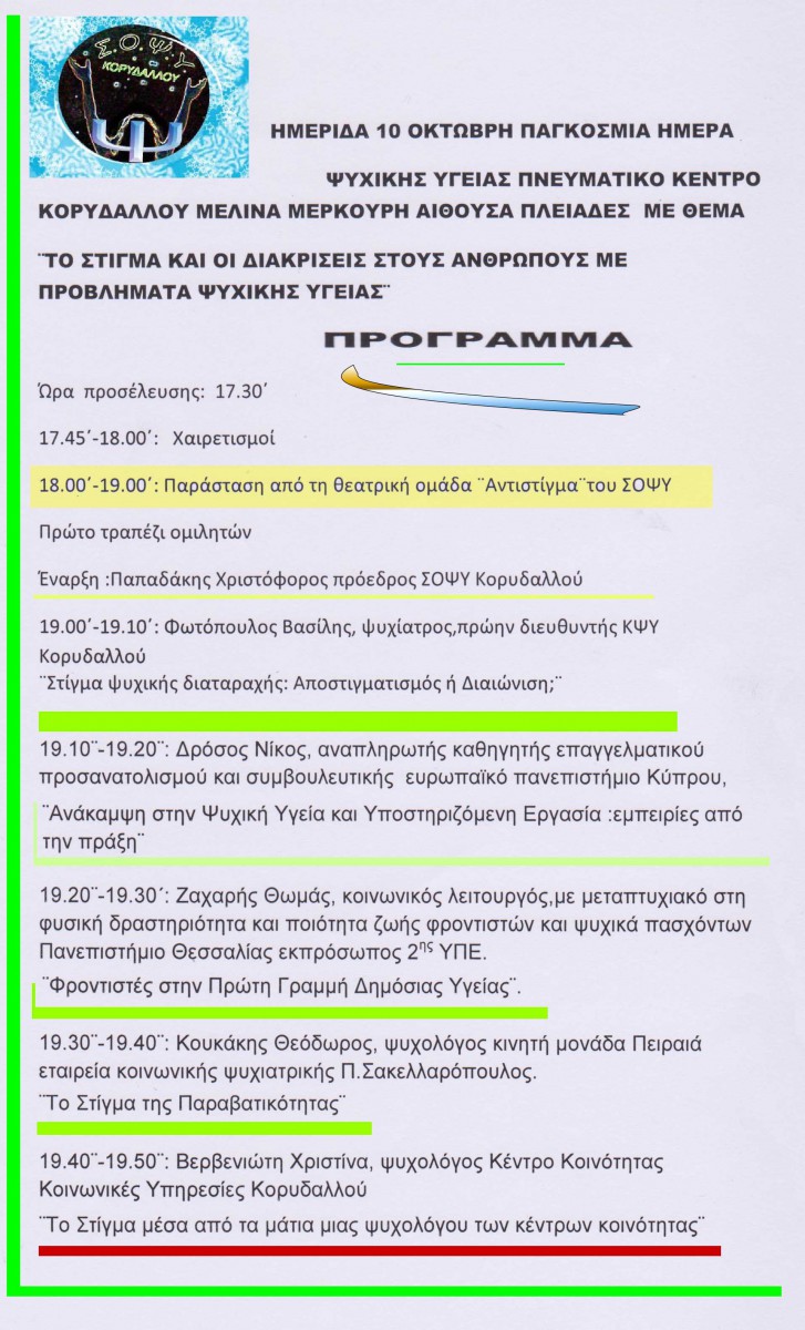 19:00- 21:00: Ημερίδα «Το στίγμα και οι διακρίσεις στους ανθρώπους με προβλήματα ψυχικής υγείας». Θα ακολουθήσουν ερωτήσεις-Συζήτηση με το κοινό.