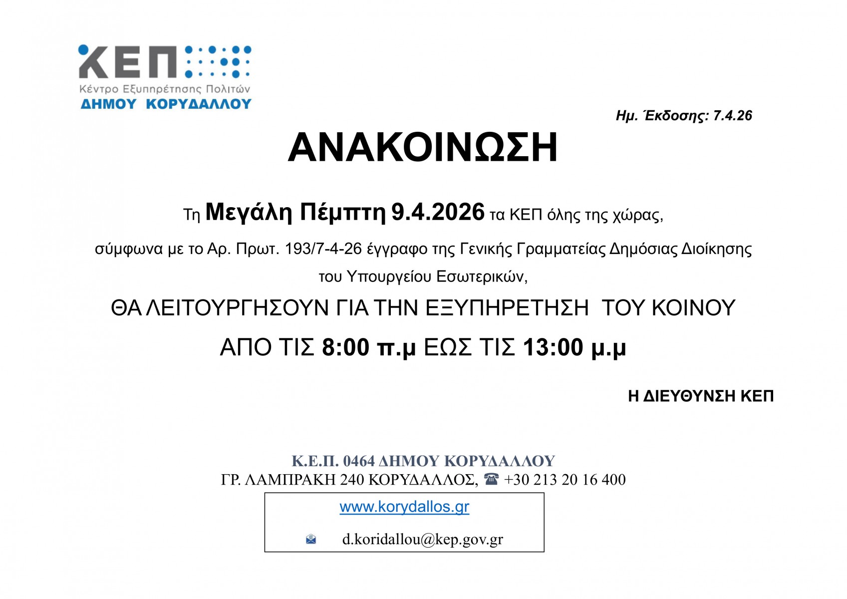 ΚΕΠ | ΩΡΑΡΙΟ ΜΕΓΑΛΗ ΠΕΜΠΤΗ View Larger Image Konstantinos Balasis2026-04-08T06:38:17+02:008 Απριλίου, 2026|ΚΕΠ, Νέα, Σημαντικά| Κοινοποιήστε αυτήν την σελίδα facebooktwitterlinkedinEmail