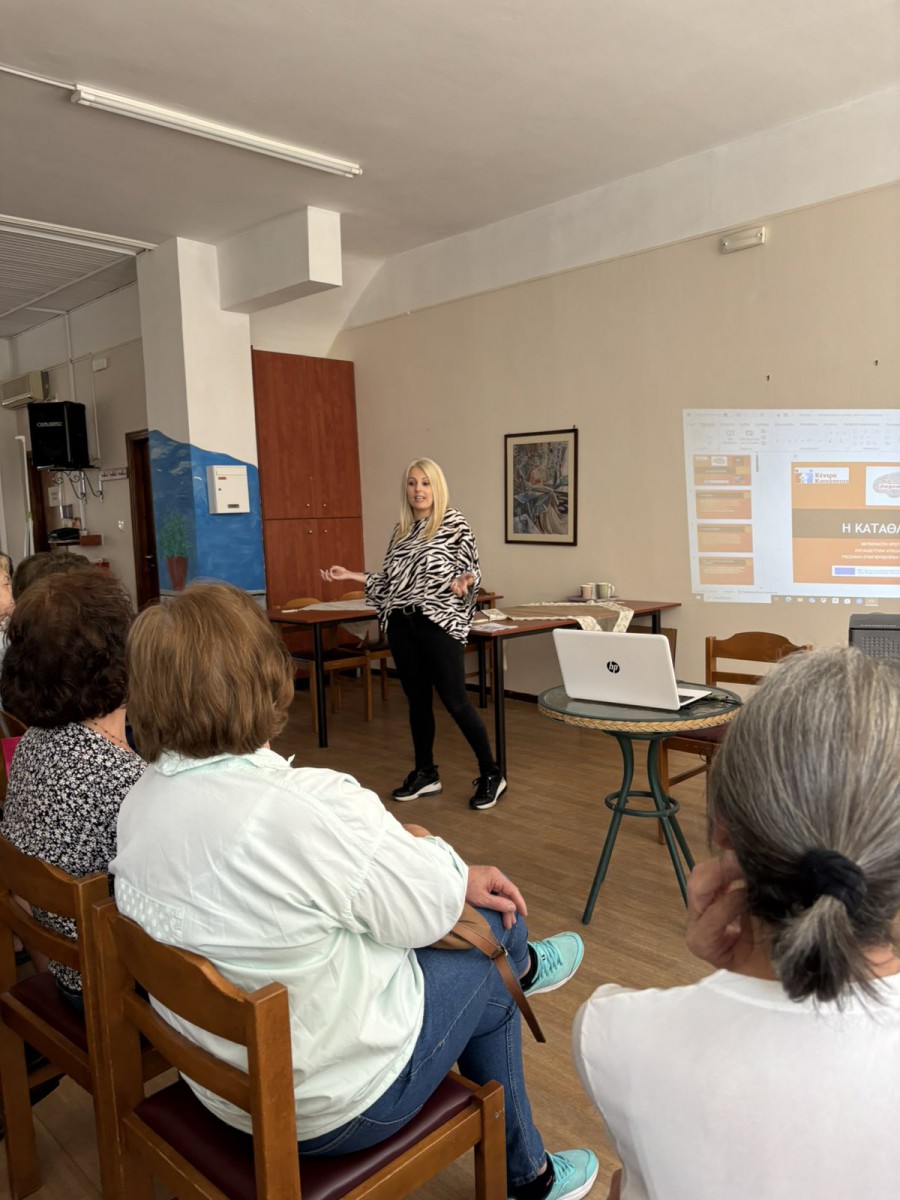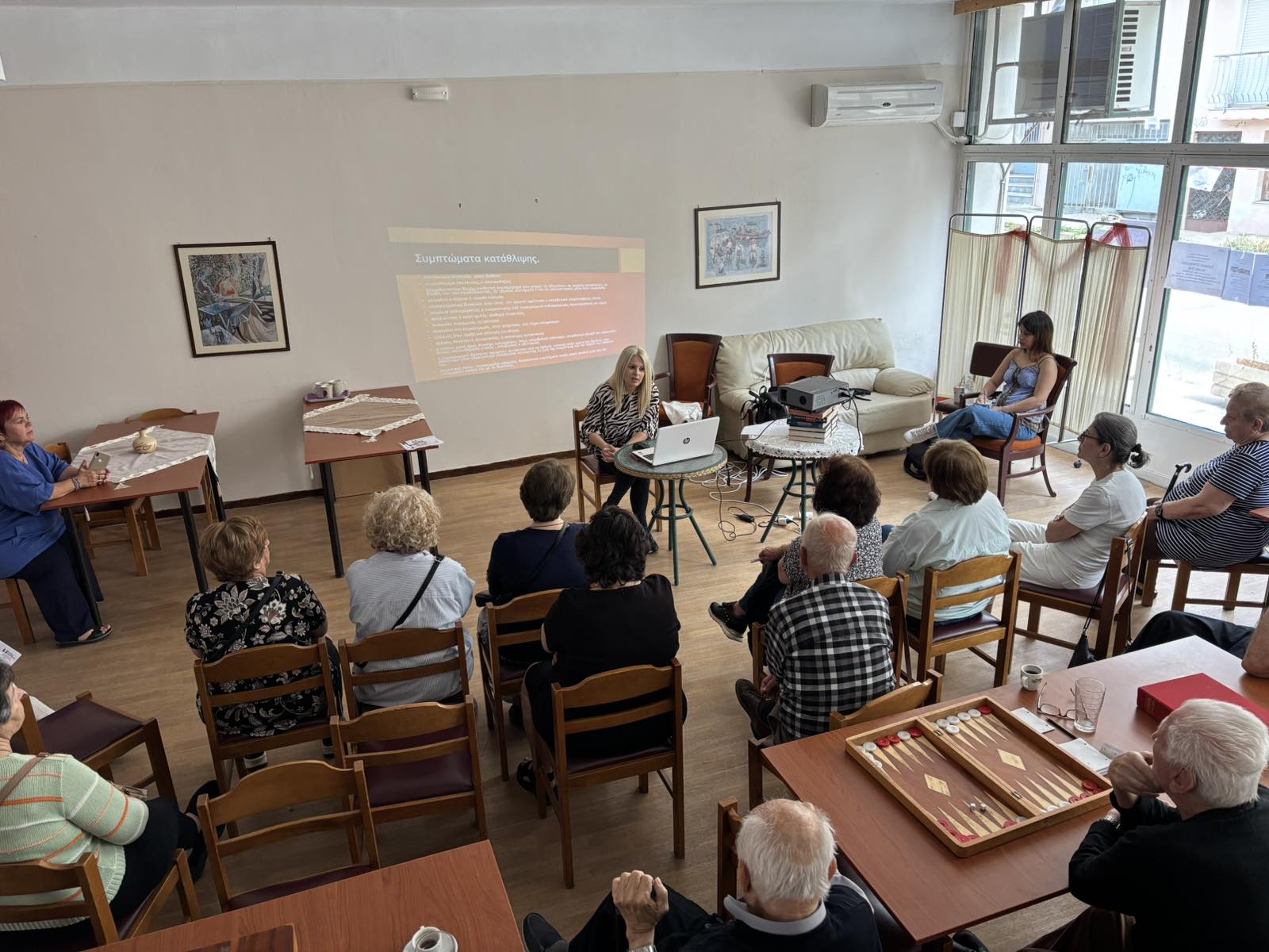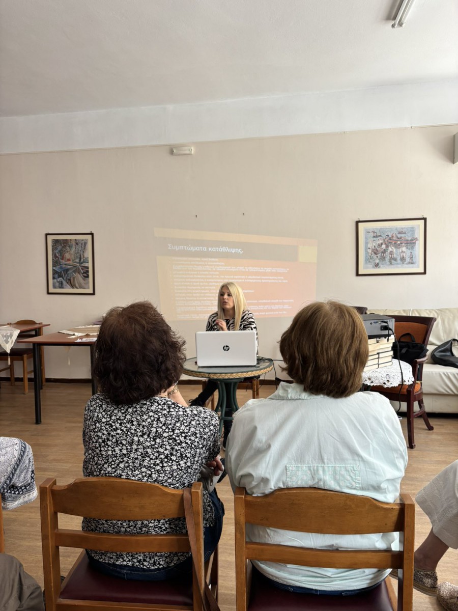 Η ομιλία διεξήχθη κατόπιν πρόσκλησης των ΚΑΠΗ, στο πλαίσιο της άμεσης συνεργασίας με το Κέντρο Κοινότητας των Κοινωνικών Υπηρεσιών. Στόχος η εξοικείωση των μελών ΚΑΠΗ με την διαταραχή της κατάθλιψης και τη διάκρισή της από τα συναισθήματα της θλίψης και της μελαγχολίας, ώστε να είναι σε θέση τόσο να αναγνωρίζουν τα συμπτώματα, όσο και να χρησιμοποιούν τεχνικές για την σωστή διαχείρισή τους.