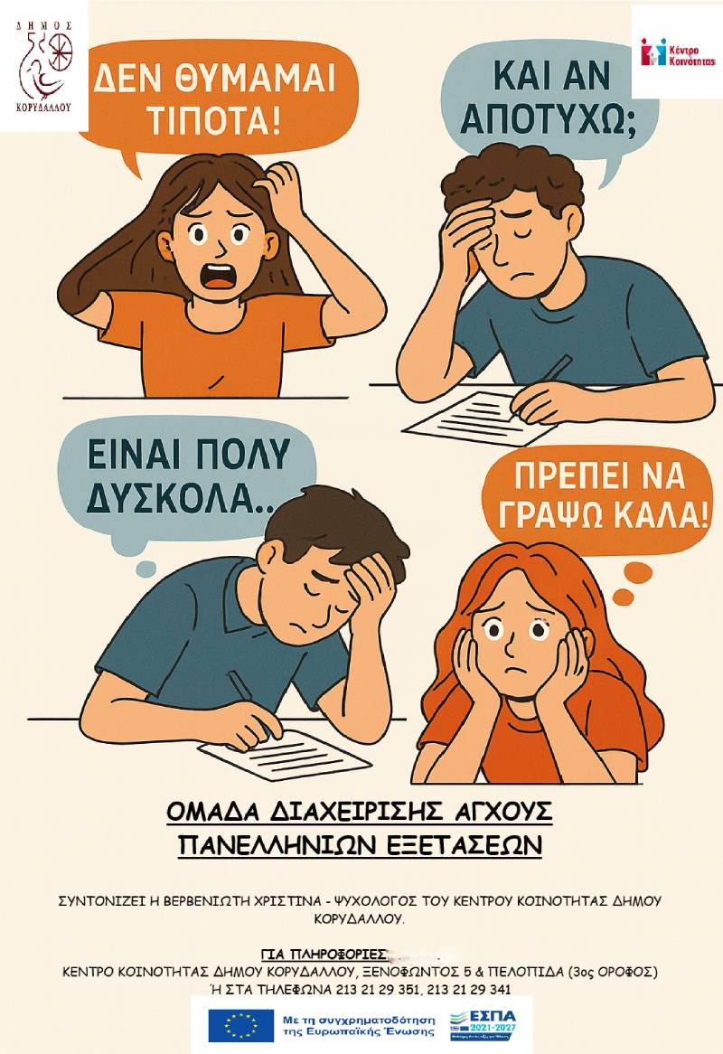 Ο Δήμος Κορυδαλλού εγκαινιάζει μία νέα Δράση στήριξης του μαθητικού πληθυσμού, με σκοπό την Εκπαίδευση των μαθητών της Γ’ Λυκείου στη διαχείριση του άγχους των επικείμενων Πανελλαδικών εξετάσεων.