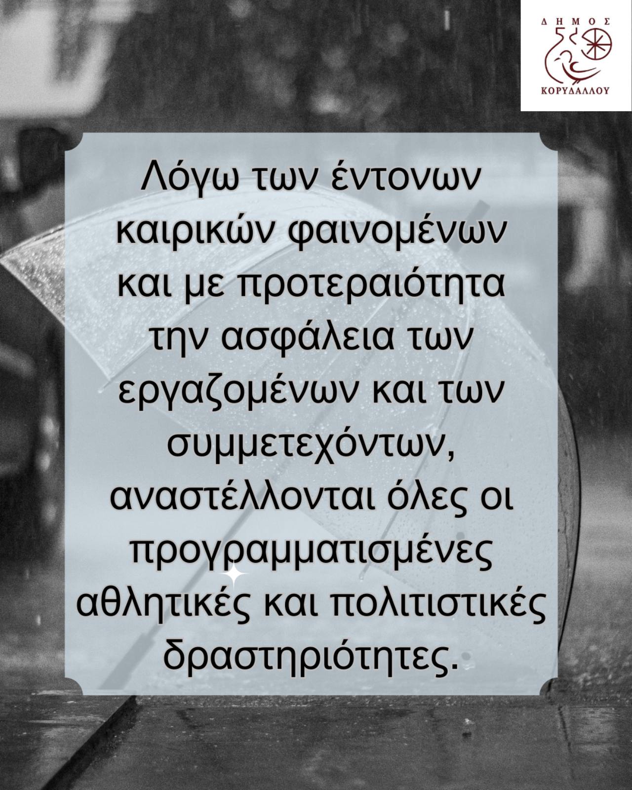 Λόγω των έντονων καιρικών φαινομένων και με προτεραιότητα την ασφάλεια των εργαζομένων και συμμετεχόντων, αναστέλλονται όλες οι προγραμματισμένες αθλητικές και πολιτιστικές δραστηριότητες.