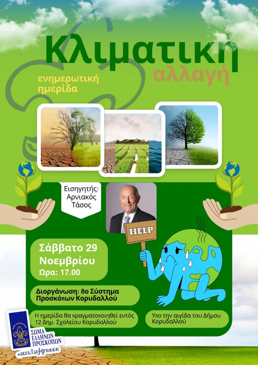 Ο Δήμος Κορυδαλλού, σε συνεργασία με το 8ο Σύστημα Προσκόπων Κορυδαλλού, διοργανώνει μια ιδιαίτερα σημαντική ενημερωτική ημερίδα με θέμα την Κλιματική Αλλαγή, το Σάββατο 29 Νοεμβρίου και ώρα 17:00, στον χώρο του 12ου Δημοτικού Σχολείου Κορυδαλλού.