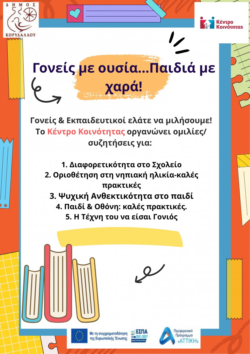 Ο Δήμος Κορυδαλλού συνεχίζει και το 2026 την καινοτόμα Δράση των ομιλιών  του Επιστημονικού Προσωπικού του Κέντρου Κοινότητας προς γονείς και εκπαιδευτικούς, με στόχο την επιμόρφωση, την ψυχοεκπαίδευση και την ενδυνάμωση του γονεϊκού ρόλου. Ομιλήτριες: Μαρία Τζουτζούλη, Κοινωνική Λειτουργός & Χρύσα Παπακυργιάκη, Ψυχολόγος.