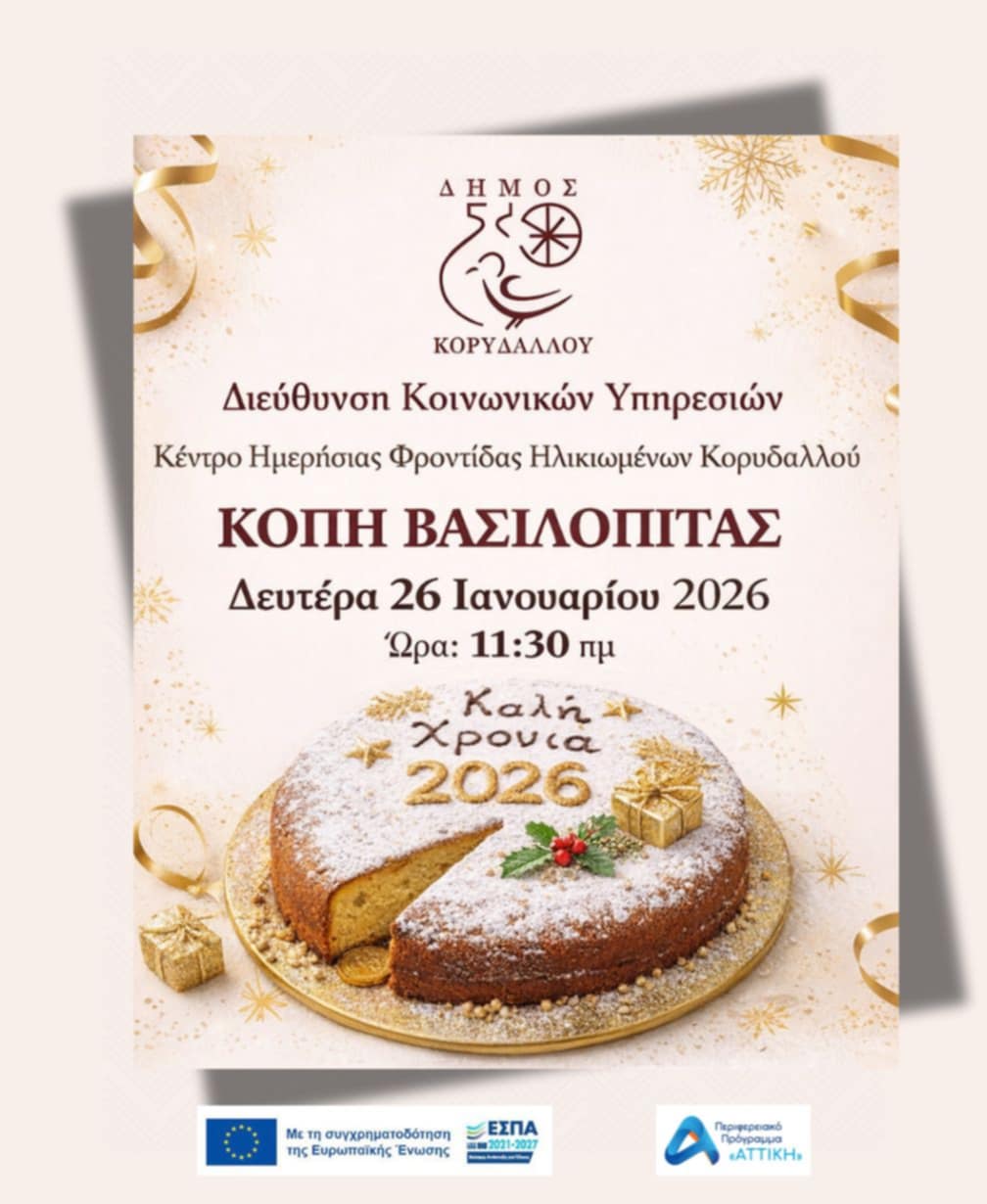 Στις 26/01/2025 πραγματοποιήθηκε σε εγκάρδιο κλίμα, η κοπή της πρωτοχρονιάτικης πίτας στο Κέντρο Ημερήσιας Φροντίδας Ηλικιωμένων (ΚΗΦΗ) του Δήμου μας, παρουσία των ωφελούμενων, του προσωπικού, εκπροσώπων της Δημοτικής Αρχής & της Περιφέρειας Αττικής. Η εκδήλωση αποτέλεσε μια όμορφη ευκαιρία ανταλλαγής ευχών και ενίσχυσης των δεσμών φροντίδας προς τους ηλικιωμένους συμπολίτες μας. Οι Κοινωνικές Υπηρεσίες συνεχίζουν να στηρίζουν με συνέπεια την τρίτη ηλικία, αναπτύσσοντας ένα δίχτυ κοινωνικής μέριμνας που προάγει την ποιότητα ζωής τους.