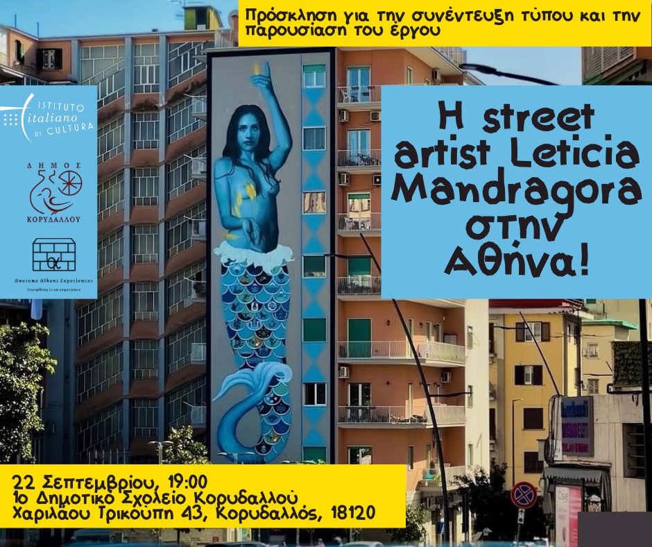 Το Ιταλικό Μορφωτικό Ινστιτούτο Αθηνών, σε συνεργασία με τον Δήμο Κορυδαλλού και την Awesome Athens Experiences, έχει τη χαρά να σας κοινοποιήσει ότι από τις 12 Σεπτεμβρίου 2025 η Ιταλο-Ισπανίδα καλλιτέχνιδα Leticia Mandragora, βρίσκεται στην Αθήνα και θα πραγματοποιήσει ένα πρότζεκτ τοιχογραφίας σε μια επιφάνεια του Δήμου Κορυδαλλού που θα παρουσιαστεί στην κοινότητα στις 22 Σεπτεμβρίου.