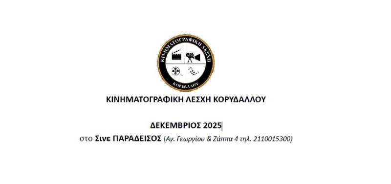 ΚΙΝΗΜΑΤΟΓΡΑΦΙΚΗ ΛΕΣΧΗ ΚΟΡΥΔΑΛΛΟΥ – ΔΕΚΕΜΒΡΙΟΣ 2025 View Larger Image Το πρόγραμμα της Κινηματογραφικής Λέσχης Κορυδαλλού για τον Δεκέμβριο του 2025 Nikos Pelekanos2025-11-27T14:50:51+02:0027 Νοεμβρίου, 2025|Νέα, Πολιτισμός| Κοινοποιήστε αυτήν την σελίδα facebooktwitterlinkedinEmail