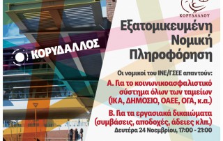 Ο Δήμος Κορυδαλλού συνεχίζει την επιτυχημένη συνεργασία του με το Ινστιτούτο Εργασίας της Γ.Σ.Ε.Ε, ανταποκρινόμενος στις ανάγκες σας & παραμένει αρωγός του πολίτη στην προστασία θεμελιωδών εργασιακών και ασφαλιστικών δικαιωμάτων. Τη Δευτέρα, 24 Νοεμβρίου 2025, ώρες 17:00-21:00, θα διεξαχθεί η ...