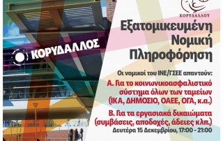 Ο Δήμος Κορυδαλλού συνεχίζει την επιτυχημένη συνεργασία του με το Ινστιτούτο Εργασίας της Γ.Σ.Ε.Ε, ανταποκρινόμενος στις ανάγκες σας & παραμένει αρωγός του πολίτη στην προστασία θεμελιωδών εργασιακών και ασφαλιστικών δικαιωμάτων. Τη Δευτέρα, 15 Δεκεμβρίου 2025, ώρες 17:00-21:00, θα διεξαχθεί η ...