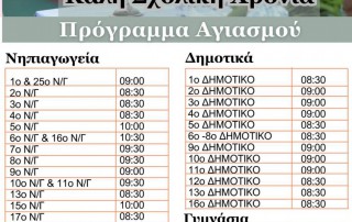 Σας ενημερώνουμε ότι ο Αγιασμός για την έναρξη της νέας σχολικής χρονιάς θα πραγματοποιηθεί στα Σχολεία μας σύμφωνα με το εικονιζόμενο πρόγραμμα. Με την ευκαιρία της νέας σχολικής χρονιάς, ευχόμαστε σε όλα τα παιδιά, τους εκπαιδευτικούς και τους γονείς μια ...
