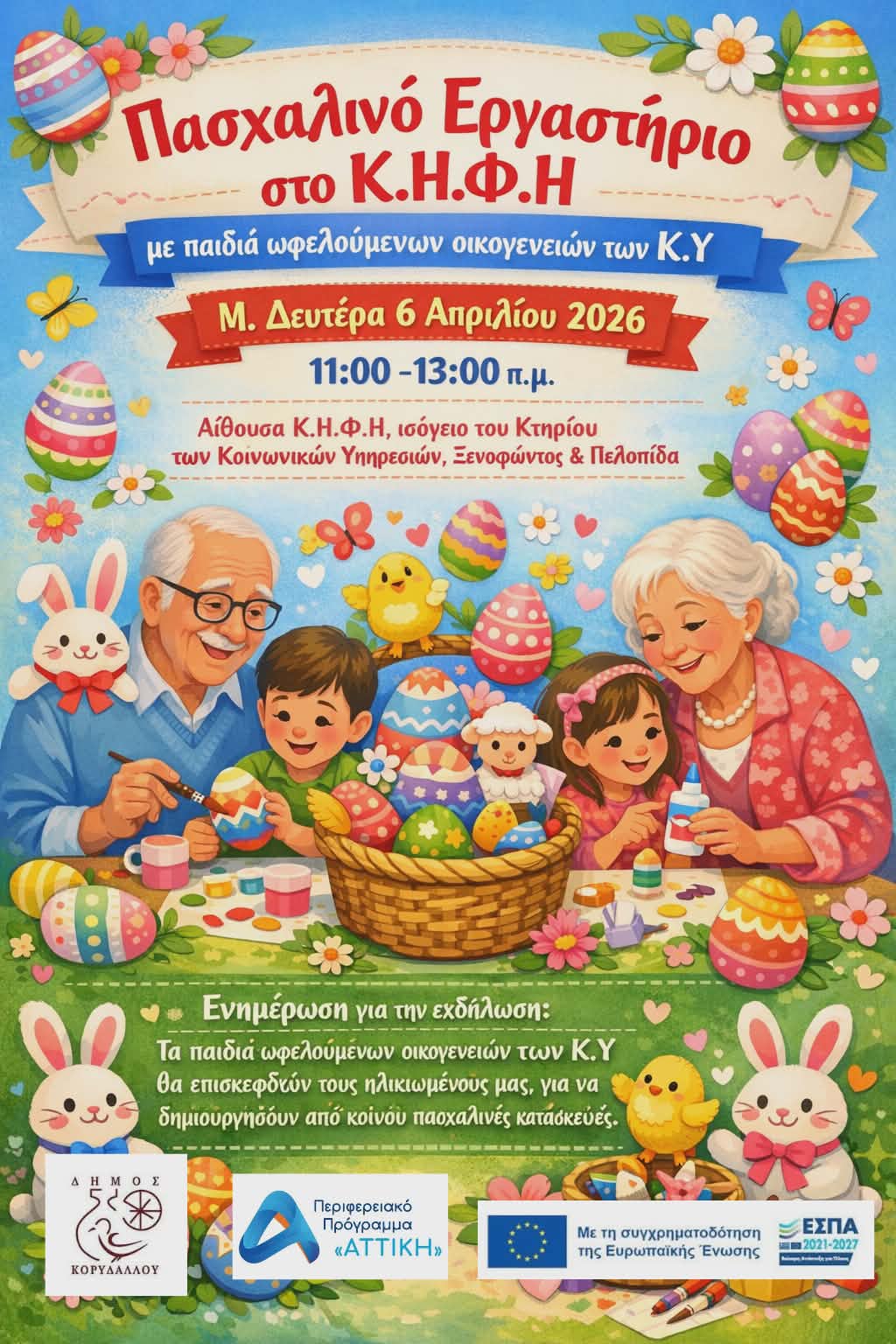 Τη Μ. Δευτέρα 6 Απριλίου, παιδιά ωφελούμενων οικογενειών των Κ.Υ επισκέφθηκαν τα μέλη του Κ.Η.Φ.Η, για να δημιουργήσουν από κοινού πασχαλινές κατασκευές. Οι ηλικιωμένοι μας τους υποδέχτηκαν με ιδιαίτερη χαρά, προσφέροντάς τους παιχνίδια και πασχαλινές λιχουδιές.