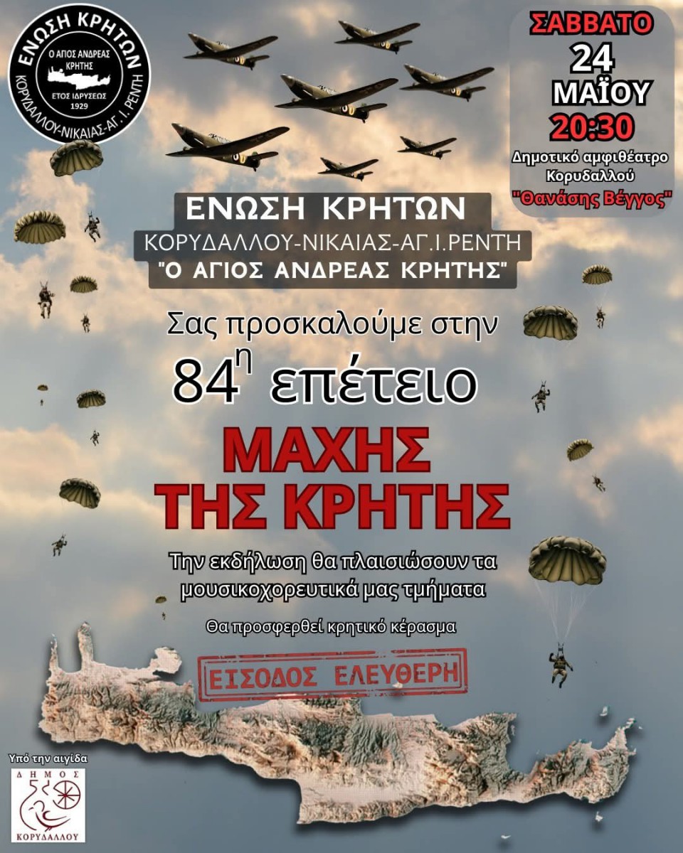 Η Ένωση Κρητών Κορυδαλλού Νίκαιας Ά. Ι. Ρέντη “Ο Άγιος Ανδρέας Κρήτης” σας προσκαλεί, στην εκδήλωση μας για την 84η επέτειο της Μάχης της Κρήτης.