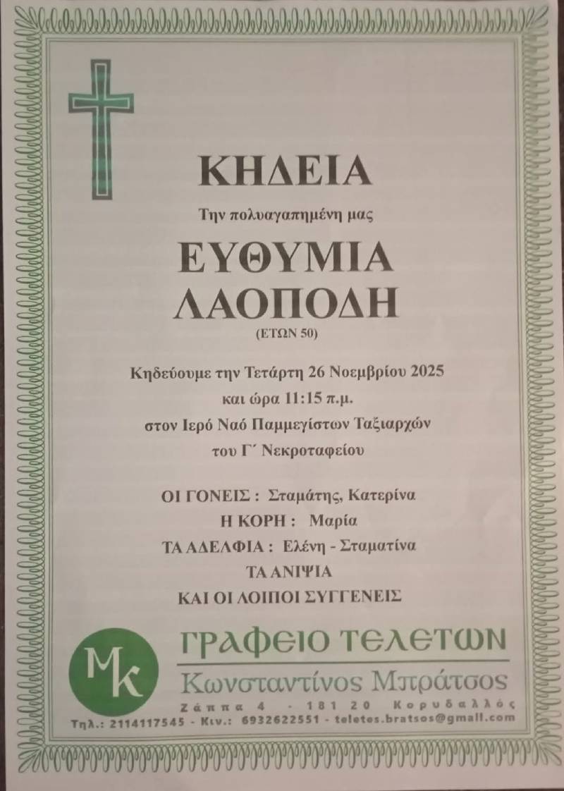 Η εξόδιος ακολουθία θα τελεστεί την Τετάρτη 27/11/2025, στο Γ’ Κοιμητήριο, στις 11:15 π.μ., στον Ιερό Ναό Ταξιαρχών (μικρή εκκλησία).