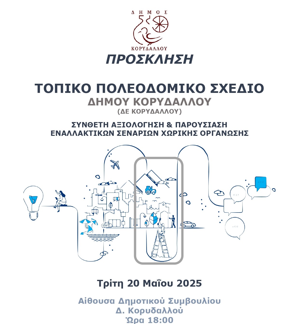 Ο Δήμος Κορυδαλλού, στο πλαίσιο της εκπόνησης της μελέτης «Τοπικό Πολεοδομικό Σχέδιο (ΤΠΣ) Δήμου Κορυδαλλού (ΔΕ ΚΟΡΥΔΑΛΛΟΥ)», διοργανώνει ανοιχτή εκδήλωση για την παρουσίαση των εναλλακτικών σεναρίων χωρικής οργάνωσης της πόλης.